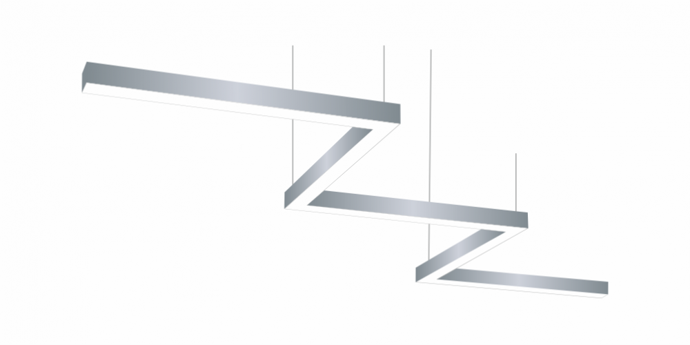 Фигурный светодиодный Светильник Зигзаг LiNE-Pro 5х500mm 90W 4000K серый предназначен для накладного или подвесного монтажа на тросовые подвесы. Изготовлен из сплошного сварного алюминиевого профиля в виде зигзага. Высота установки светильника регулируется подвесом с цанговым тросовым зажимом и может варьироваться от 0,05 метра до 4 метров от основного потолка. Светильник Зигзаг имеет равномерную засветку по всей площади рассеивателя. Источник питания находится внутри корпуса. Торцевые заглушки входят в комплект. Возможно изготовление светильника с магистральной проводкой для соединения нескольких светильников в сплошную конструкцию