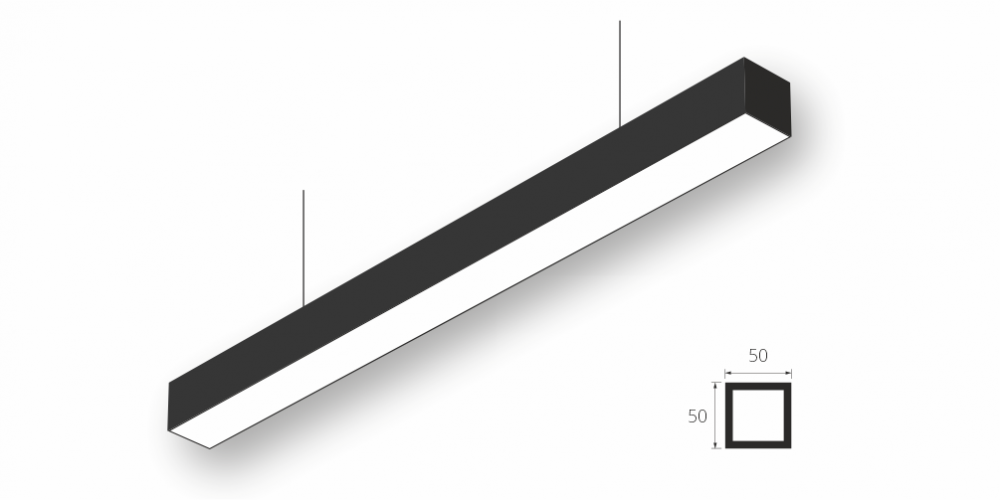 Линейный модульный светодиодный Подвесной светильник LiNE-Pro 50x50 2500mm 38W 6000K Черный предназначен для подвесного монтажа на тросовые подвесы. Изготовлен из алюминиевого профиля длиной 2500 мм, мощностью 38 Вт c цветовой температурой 6000 K, цвет корпуса Черный. Светильники соединяются в сплошную линию с помощью комплекта линейного соединения и сплошной магистральной проводки. Светильник имеет равномерную засветку по всей площади рассеивателя. Источник питания находится внутри корпуса.
